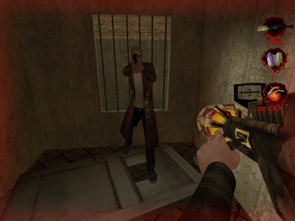 He can be found on Wednesday worshipping the A/C unit which the Postal Dude has been sent to retrieve. John is equipped with a Glock and Dynamite, 2 signature weapons from Eternal Damnation, and wears body armor. He is quite tough and can survive roughly as much damage as a SWAT officer or RWS staff member. Additionally, he has the unique attribute of only taking half damage from automatic weapons (the Machine Gun or MP5), requiring 43 machine gun rounds to kill, which is more than any other non-boss human enemy in Paradise Lost other than Phraud Hogslop. He is also resistant to being set on fire and immune to most instant death attacks, such as dismemberment from bladed melee weapons or head-bursting from the Sledgehammer or a close range Shotgun headshot. He can still be killed instantly with the revolver's execution secondary fire, and is vulnerable to the anthrax-filled cow head.