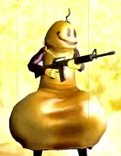 Krotchy is invulnerable to bullets, but can be harmed by explosives or melee weapons. Napalm in particular is super effective. Krotchy himself is armed with a Rocket Launcher and a Shotgun. He fires heat seeking rockets from the rocket launcher, and will switch to the shotgun at close range.