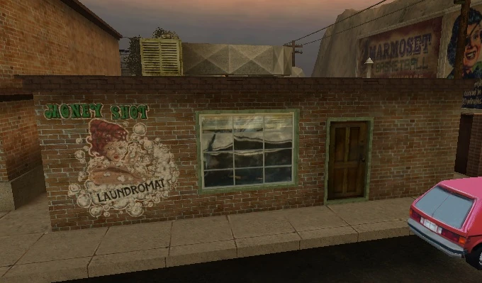 Money Shot Laundromat is the laundromat located in the Home area. Though accessible since Monday, the laundromat doesn't begin service till Wednesday when the Postal Dude must get his own clothes back after being kidnapped by a group of Rednecks and forced to wear a Gimp Suit. The Postal Dude can either pay or get into the counter to get his clothes back.