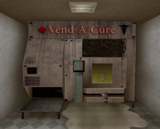 A Vend-A-Cure machine are also seen in the Hospital on Saturday in Apocalypse Weekend. Pissing into it will give the Dude a Health Pipe.